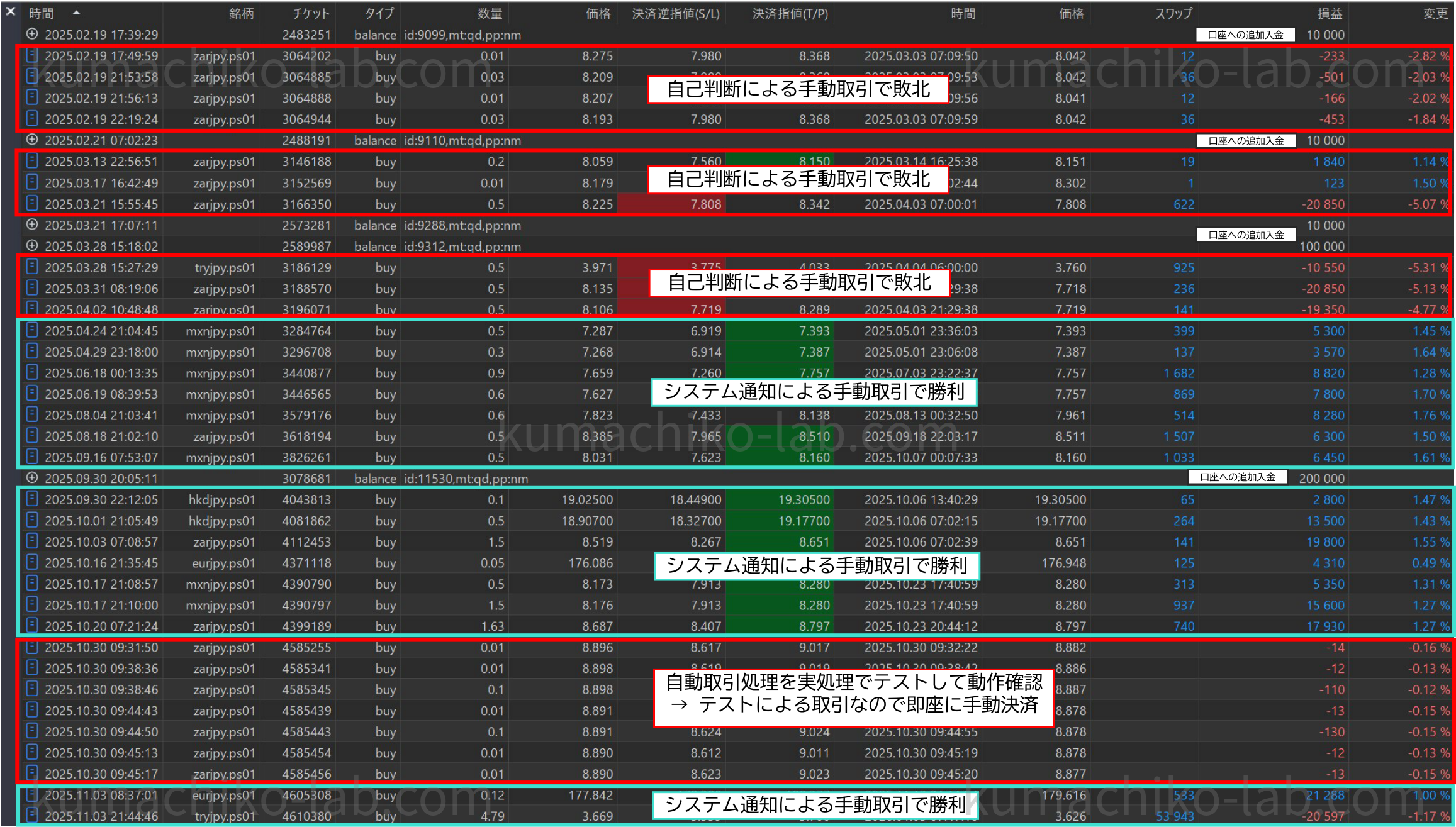 2025年4月から12月まで、毎月数回ずつの取引が発生しています。しかも、過去の陸奥とは違い、複数の通貨ペアそれぞれでです。